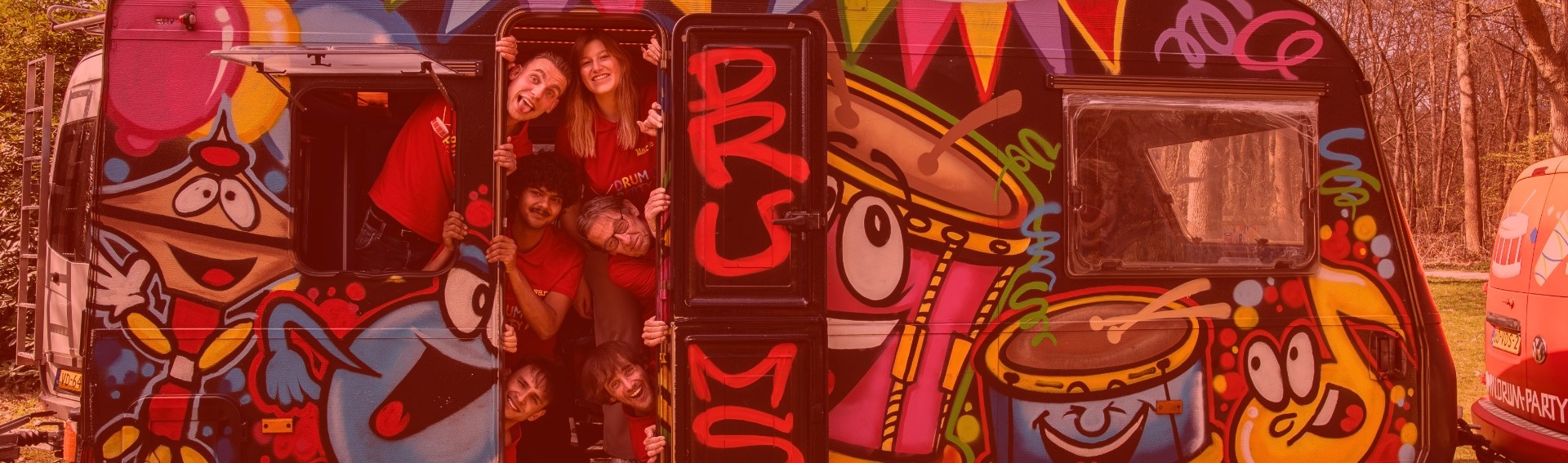 Met drie eigen aanhangers reizen we door heel Nederland en Vlaanderen om overal drumworkshops te verzorgen.